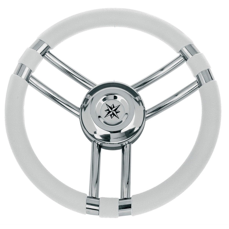 Volante a tre razze in ACCIAIO INOX e corona in poliuretano, completo di mozzo universale.