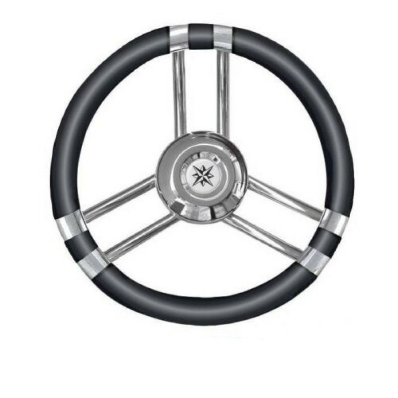 Volante a tre razze in ACCIAIO INOX e corona in poliuretano, completo di mozzo universale.